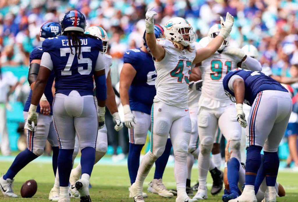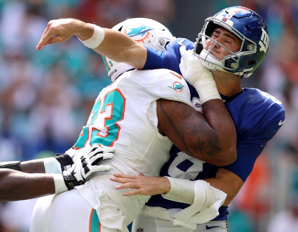 The Giants also lost quarterback Daniel Jones to a neck injury when he was sacked by Andrew Van Ginkel in the fourth quarter. That was the sixth time Jones was sacked on Sunday and the 28th time this season.