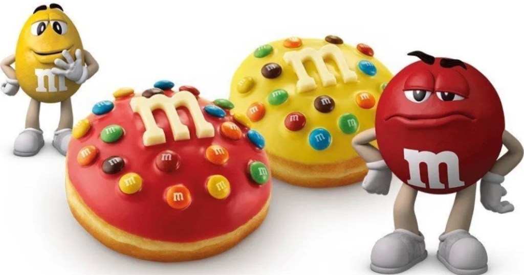 - Chocolate Iced Doughnut Topped with M&M’s: An Original Glazed doughnut handdipped in classic chocolate icing, then covered with M&M’s MINIS Milk Chocolate Candies and crispy rainbow dots.