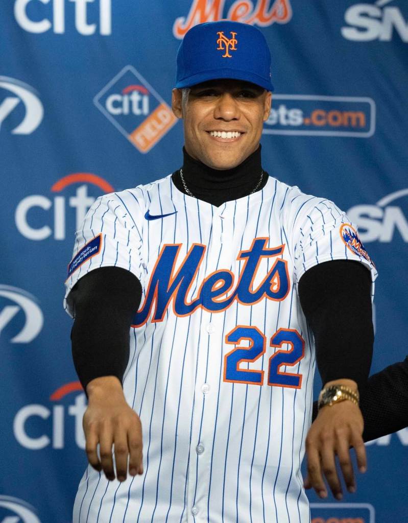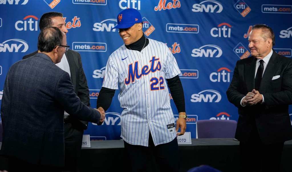 Juan Soto was introduced at Citi Field after his record $765 million, 15-year contract was finalized. He was flanked by Mets owner Steve Cohen, president of baseball operations David Stearns and agent Scott Boras.